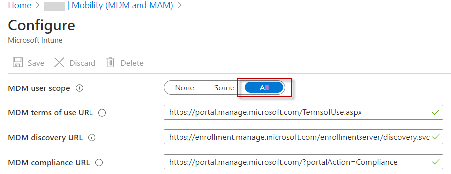 - The MDM terms and conditions in Azure AD is blank or doesn’t contain the correct URL.