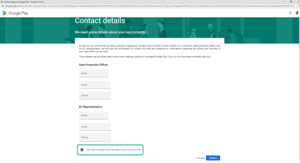 6. Add the contact details if you have them handy or you can also add them in the Admin section later, accept the agreement and click Confirm.