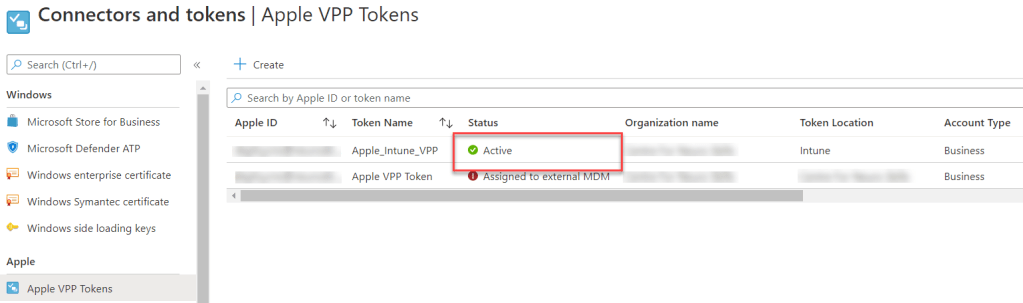 - Select Tenant administration > Connectors and tokens > Apple VPP tokens.