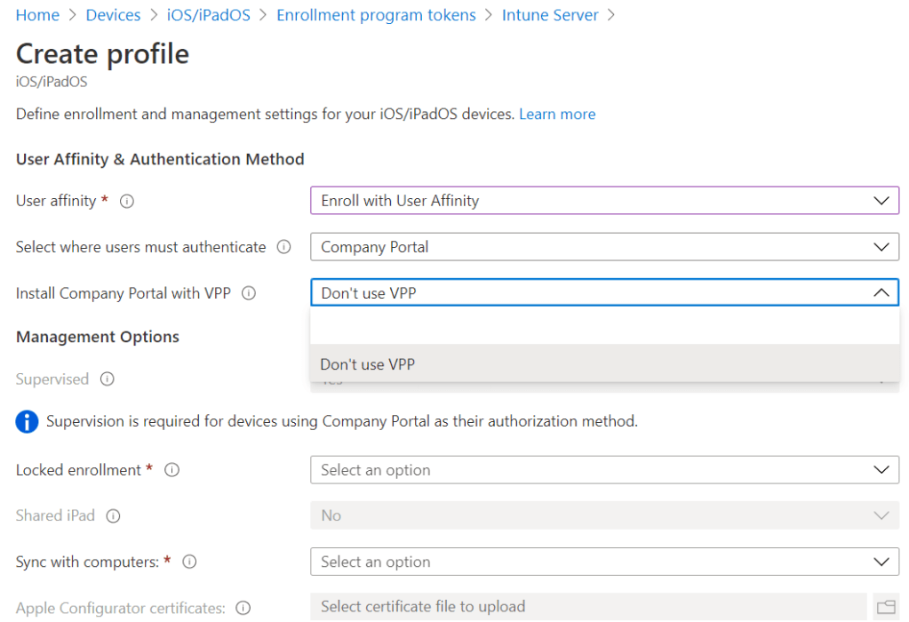 Working with a customer last week, I realized that we were not able to push Company Portal app on supervised devices when creating the profile, the token was not present on the “Install Company Portal with VPP” option even though it was previously configured in the tenant.